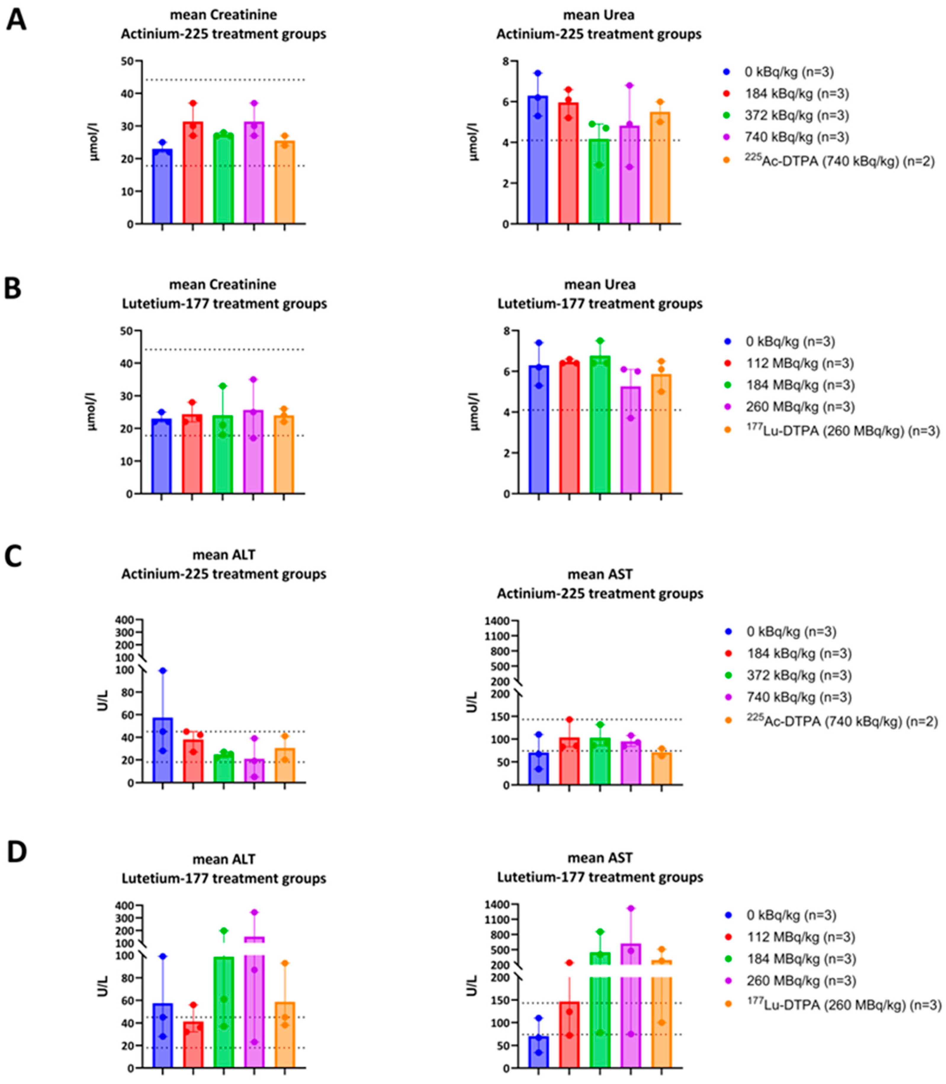 177Lu-4497 treatment group exhibited a dose-dependent increase in ALT and AST, unlike the