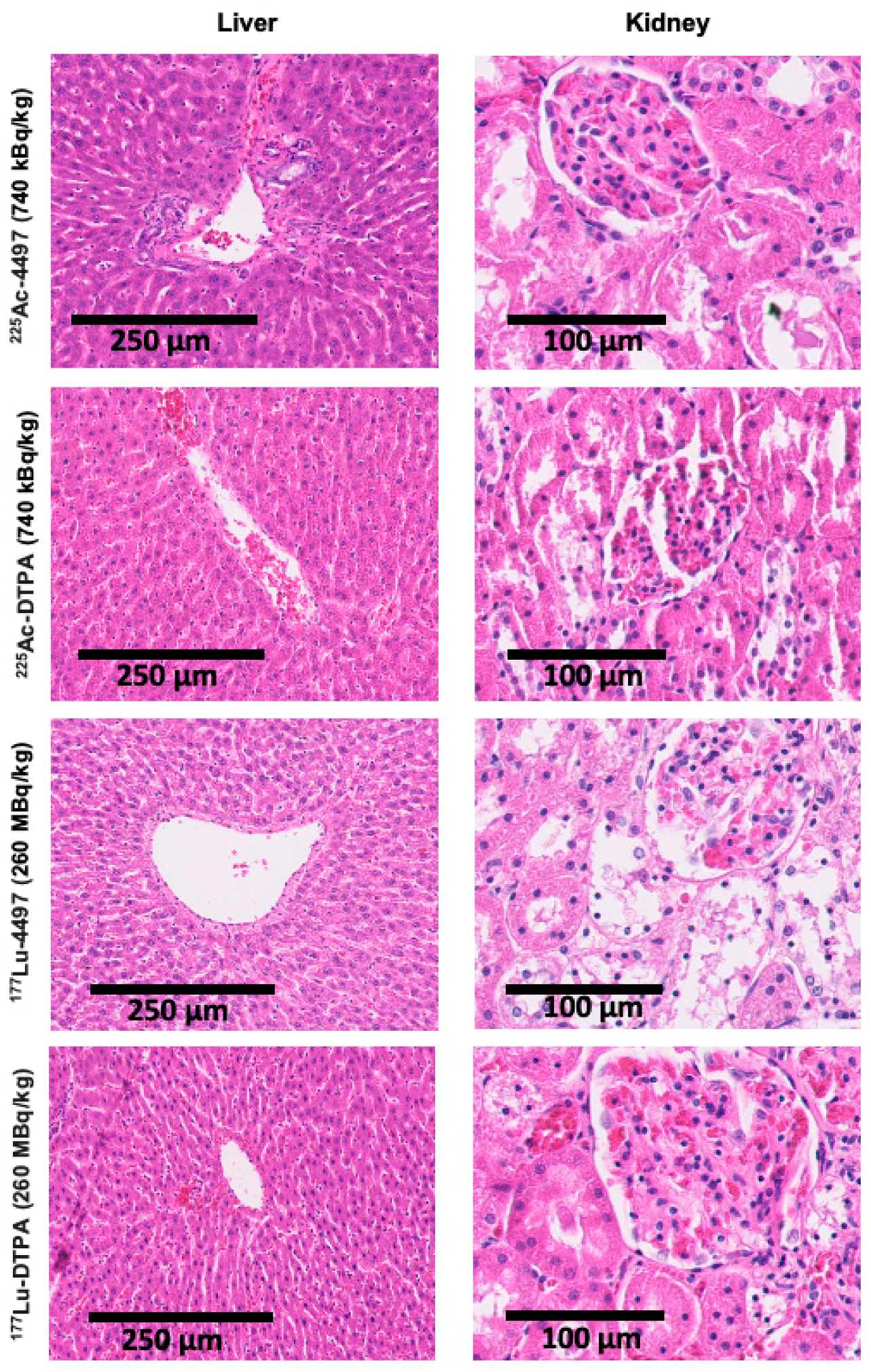 Histopathological analysis of radiation damage to the liver and kidney were investigated by fixing the organs in 4% w/v formaldehyde. Subsequently, the samples were dehydrated in an ethanol series. Thereafter, the samples were embedded in paraffin and cut into 6 µm thick slices using a sawing microtome (Leica, Nussloch, Germany). The slices were stained with hematoxylin and eosin (H&E). assessed the slices for organ damage. The kidney samples were evaluated for renal architecture, glomerular, and tubulointerstitial changes. The liver samples were evaluated for liver architecture, fibrosis, and hepatocellular changes.