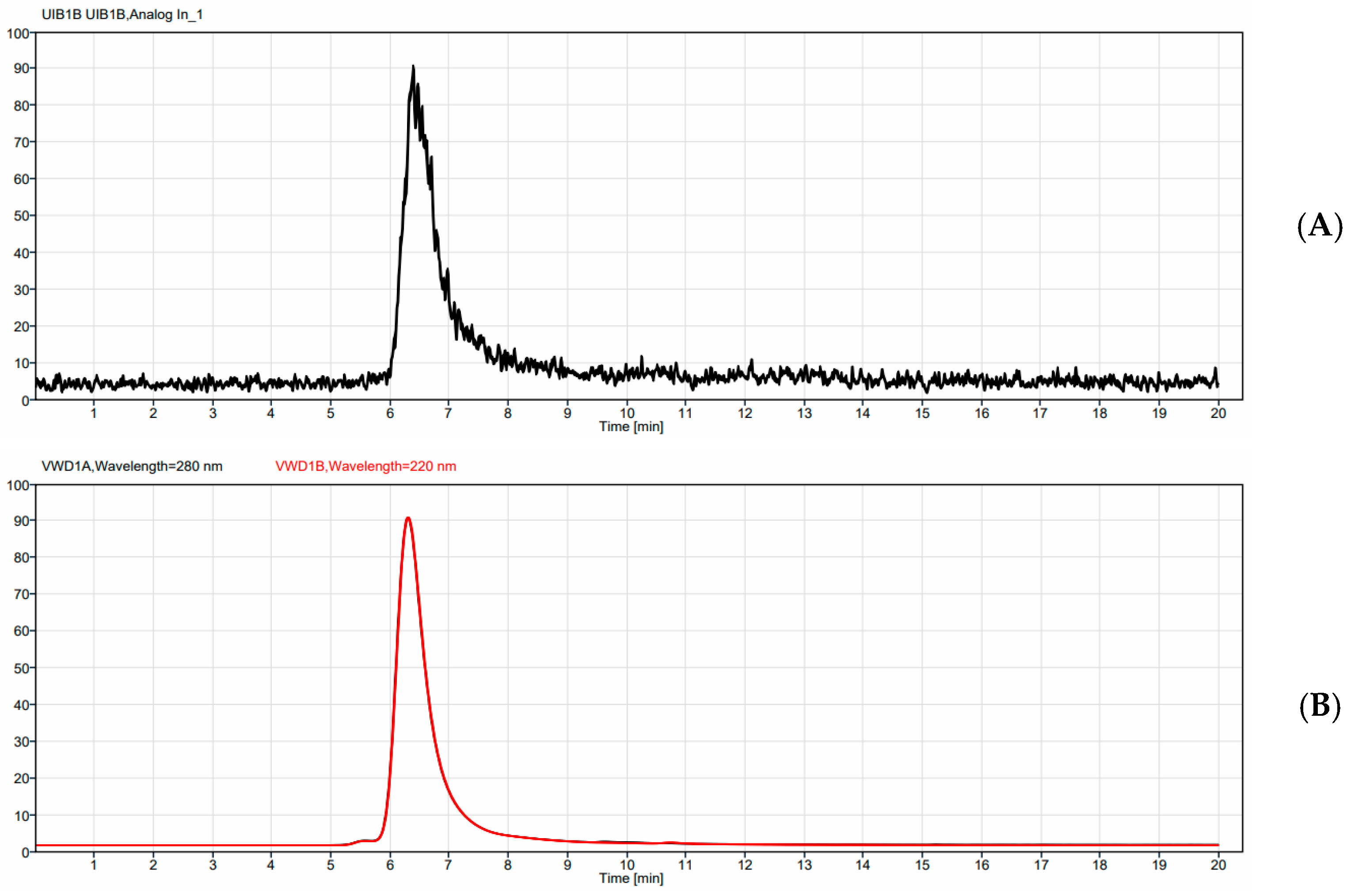 Samples of each radio-conjugate were then run on an Agilent HPLC (Agilent Technologies Inc., Santa Clara, CA, USA) equipped with a UV detector monitoring at UV = 280, a BioScan radioactivity detector (Eckert & Ziegler, Valencia, CA, USA), and a TSKgel SuperSw2000, 4.6 mm I.D. X 30 cm, 4 µm SEC column (TOSOH Bioscience, Tokyo, Japan). An isocratic method was run for 20 min with a 150 mM Sodium Phosphate buffer, pH 7, as the eluant.