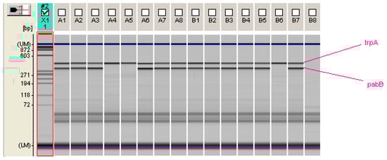 Microchip electrophoresis for pabB and trpA genes in E. coli O25 ST131. trpA—427 bp, pabB—347 bp; DNA ladder-X1; positive isolates E. coli O25 ST131—A1, A2, A3, A6, A7, A8, B1, B2, B3, B4, B5; negative isolates E. coli O25—A4, A5; E. coli ATCC 25,922—B6; positive control E. coli ST131—B7; negative control H2O for PCR—B8.