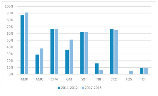 Comparison of resistance to antibiotics in two study periods; AMP–ampicillin, AMC–amoxicillin clavulanic acid, CFM–cefixime, GM–gentamicin, SXT–sulfamethoxazole–trimethoprim, NIF–nitrofurantoin, CRO–ceftriaxone, FOS–fosfomycin, CT–ceftolozane–tazobactam.