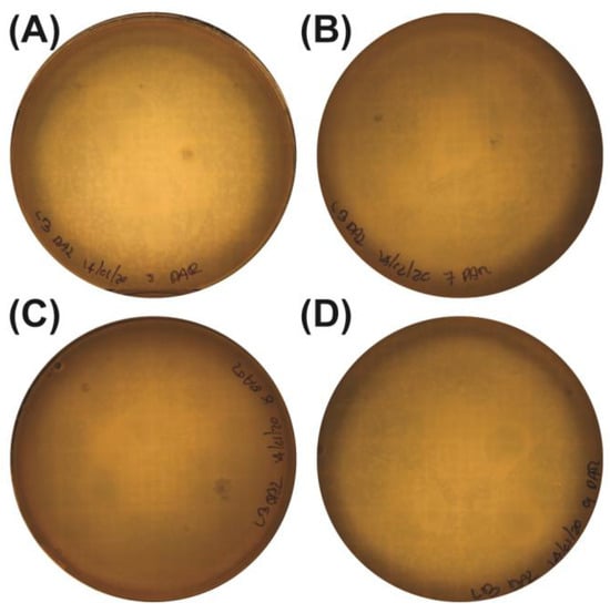 Subsequently, 3 mL aliquots of the phage–bacteria mixture were dispensed onto Petri dishes pre-coated with LB base agar (2% agar). The plates were incubated for 20 h at 37 °C to allow for visible plaque formation indicative of phage lytic activity. After the incubation, the soft agar from each plate was collected into a single 50 mL tube, representing the amplified sample. The viral titers were then determined using the double-layer agar (DLA) technique.