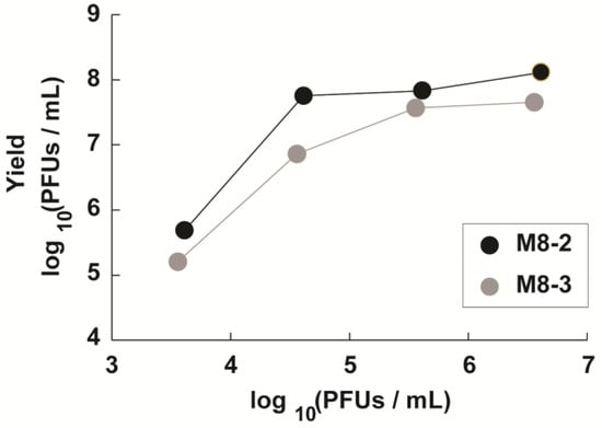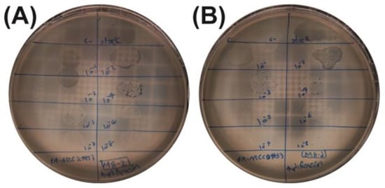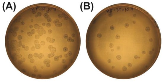 Subsequently, the viral titer was determined by performing a spot test viral titer assay on the DLA of both the M8-2 and M8-3 phage samples. Serial dilutions (from 10−1 to 10−6) of each phage sample were prepared in SM buffer, adjusting each dilution to a final volume of 100 µL. From each dilution, 10 µL was spotted onto double-layer agar plates. After allowing the spots to dry, the plates were incubated at 37 °C for 20 h. The resulting plaques were counted, and the viral titer was quantified based on the dilution factors and plaque-forming units (PFUs) per mL, following standard DLA quantification methods.