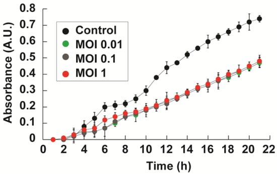 33]. This proportional growth suggests that resistant bacterial populations did not emerge, as there were no changes in bacterial growth rate in the presence of the phages [