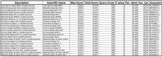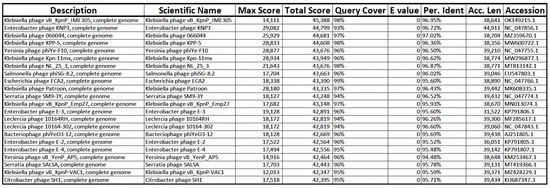 −10) was applied to identify significant matches, providing insights into the genetic relationships of the isolated phages with previously characterized viruses.
