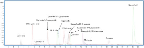 Gallic acid (CAS Number 149-91-7), chlorogenic acid (CAS Number 327-97-9), oenothein B (CAS Number 104987-36-2), myricitrin (CAS Number 17912-87-7), quercetin-3-O-glucuronide (CAS Number 22688-79-5), hyperoside (CAS Number 482-36-0), ellagic acid (CAS Number 476-66-4), kaempferol-3-O-glucoside (CAS Number 480-10-4), quercitrin (CAS Number 522-12-3), myricetin (CAS Number 529-44-2), kaempferol-3-O-rhamnoside (CAS Number 482-39-3), quercetin (CAS Number 117-39-5), kaempferol (CAS Number 520-18-3), and oenothein B were purchased from Merck (Milan, Italy). Myricetin-3-O-galactoside (CAS Number 15648-86-9) and kaempferol-3-O-glucuronide (CAS Number 22688-78-4) were purchased from Extrasynthese (Genay, France). Individual stock solutions of each analyte, at a concentration of 1000 µg/mL, were prepared by dissolving pure standard compounds in HPLC-grade methanol:water (80:20) and storing them in glass-stoppered bottles at 4 °C. Regarding ellagic acid, the stock solution was prepared by dissolving 5 mg in 25 mL of an HPLC-grade acetone:acetonitrile:ethanol mixture (1:1:1). HPLC-grade methanol was purchased by Carlo Erba (Milan, Italy), while HPLC-grade formic acid (99%) was acquired from Merck (Darmstadt, Germany), as well as the resin AmberliteTM XAD7HP. A Milli-Q SP Reagent Water System (Millipore, Bedford, MA, USA) was employed to produce ultrapure water. All the solutions were filtered with Phenex™ RC 4 mm 0.2 µM syringeless filters (Phenomenex, Castel Maggiore, Italy) prior to the analysis.