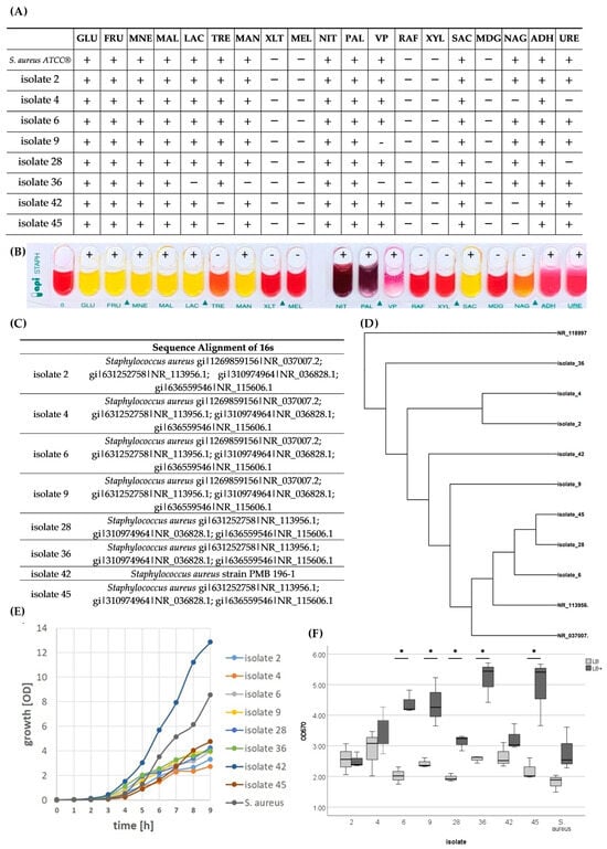 Characterization of S. aureus isolates from implant associated infections. (A) Result of the API® Staph. test of isolates obtained from patients that underwent surgery for an implant-associated infection. (B) Color-changing strip of patient 42 is presented as an example. (C) Homologies of S. aureus isolates based on 16S rRNA sequencing, and (D) phylogenetic tree based on DNA likelihood with molecular clock. (E) Growth curve of the isolates in LB medium. (F) Biofilm formation of the isolates in LB and LB medium supplemented with NaCl and glucose. 0: blank; GLU: D-Glucose; FRU: D-Fructose; MNE: D-Mannose; MAL: D-Maltose; LAC: D-Lactose; TRE: D-Trehalose; MAN: D-Mannitol; XLT: Xylitol; MEL: D-Melibiose: NIT: Kaliumnitrat: PAL: ß-Naphthol-Phosphat; VP: Voges Proskauer; RAF: D-Raffinose; XYL: D-Xylose; SAC: D-Saccharose; MDG: Methyl-αD Glucopyranoside; NAG: N-acetyl-glucosamine; ADH: Arginine DiHydrolase; URE: UREase; +: Positive; −: Negative.