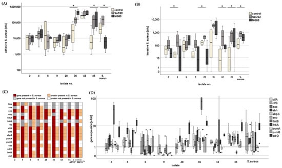 Next, the invasion capabilities of the various S. aureus strains to the MG63 and SaOS2 cells were investigated. For this purpose, confluent layers of both cell lines were incubated with a bacterial suspension of S. aureus strains for 30 min, followed by an incubation in DMEM supplemented with 30 μg/mL gentamicin for selective elimination of extracellular bacteria while preserving intracellular ones. After one day, the cells were lysed, and the number of intracellular bacteria was determined by plating serial dilutions of the lysates on LB-agar plates and counting colony-forming units (CFUs). As depicted in Figure 2B, no differences in invasion capabilities were detected among the various S. aureus isolates.