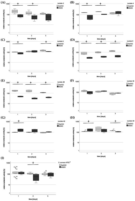 Cellular viability of osteoblasts after S. aureus infection. (A–I) Confluent layers of SaOS2 and MG63 osteoblasts were exposed to the different bacterial isolates (harvested during the stationary phase) for 30 min. Following incubation, non-adherent bacteria were removed by washing with PBS. Subsequently, DMEM supplemented with 10% FCS and 30 μg/mL gentamicin was applied to eliminate extracellular while preserving intracellular bacteria. After 1, 2, and 3 days metabolic activity was determined using MTT assay (+ p < 0.05 indicating significant difference between SaOS2 and MG63 cells; * p < 0.05 indicating a significant difference between single time points).