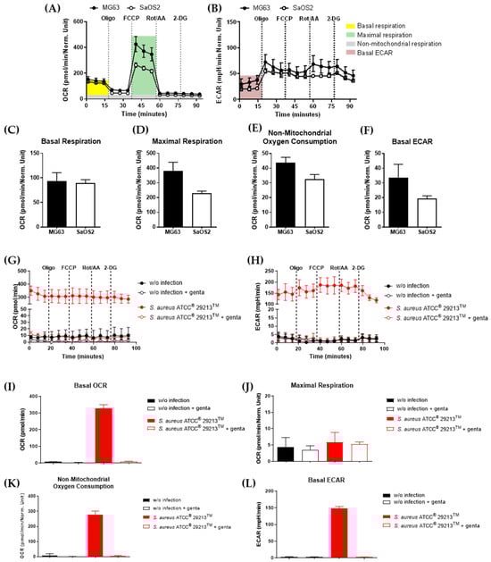 Osteoblasts and S. aureus differ in their bioenergetic profiles. (A) Oxygen consumption rate (OCR) and (B) extracellular acidification rate (ECAR) of MG63 and SaOS2 cells. The OCR was measured under basal and stressed conditions using Seahorse technology with a Mito Stress Test by sequential injections of oligomycin (Oligo), FCCP, rotenone/antimycin A (Rot/AA) 24 h after seeding. (C–F) A calculation of mitochondrial activity was performed as illustrated. Maximal respiration resulted from the OCR after the injection of FCCP minus the OCR after injection of oligomycin. Non-mitochondrial oxygen consumption rates were obtained by the OCR levels after Rot/AA injection. (G,H) Respiratory activity of S. aureus ATCC® 29213TM in osteoblast-free conditions after 24 h and (I–L) metabolic parameters calculated in accordance with (A), respectively. genta: gentamicin.