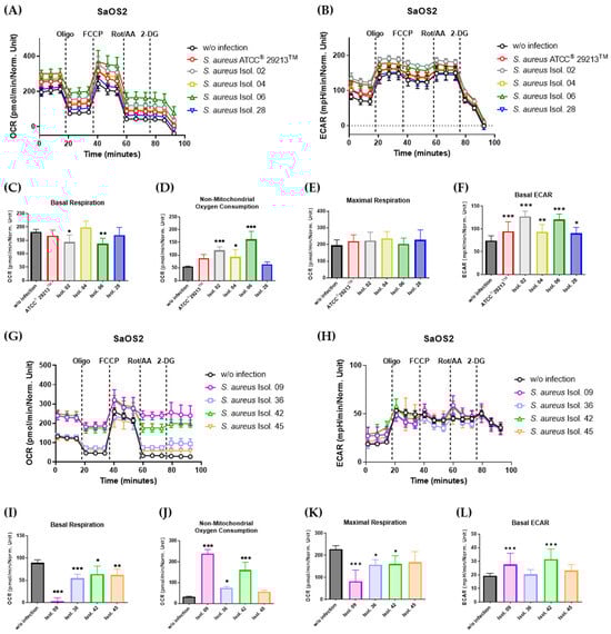 Interestingly, infection of MG63 osteoblasts with any patient-derived S. aureus strains did not influence the basal respiration (Figure 5C,I) and the maximal respiratory capacity of the osteoblasts (Figure 5E,K), whereas the non-mitochondrial oxygen consumption of MG63 cells was significantly elevated by all implant-derived S. aureus strains, except isolate 36 and 45 (Figure 5D,J). On the other hand, S. aureus strains did not have a significant impact on the overall glycolytic activity, as confirmed by similar basal glycolytic activity among the uninfected and infected MG63 cells (Figure 5F,L).