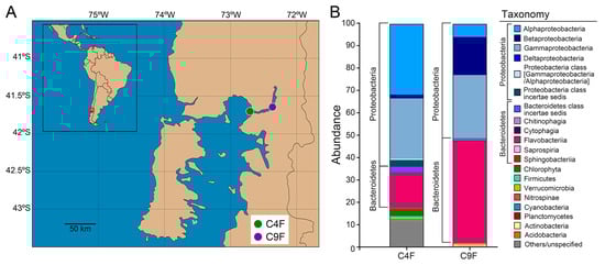 Characteristics of surface seawater bacterial samples from two fish farms in southern Chile. (A) Geographical location of surface seawater samples collected from salmon farms in autumn (C4F) and spring (C9F). (B) Taxonomy description (mOTUs) of samples C4F and C9F at phylum level and class level for the two most abundant phyla (Proteobacteria and Bacteroidetes).