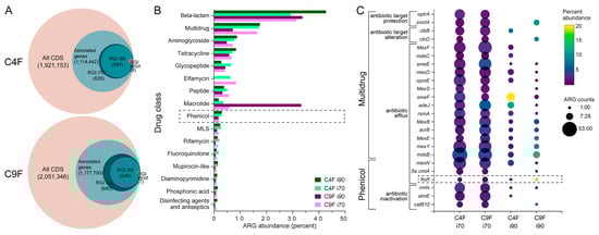 Phenicol resistance genes were classified into two subgroups: genes conferring resistance to phenicols only and multidrug resistance genes (Figure 2C). As observed for all drug classes (Figure 1B), multidrug ARGs conferring resistance to phenicols increased in number and abundance when the i70 threshold was used. Multidrug ARGs represented the most abundant and most repeated (in gene counts) phenicol resistance genes in both samples, and their main resistance mechanism was antibiotic efflux, followed by antibiotic target protection and target alteration. Conversely, phenicol-specific genes were less represented, but, interestingly, the most abundant ARG when using more stringent parameters (i90) was floR, although the number of gene counts was similar between i70 and i90 (two vs. one for C4F and four vs. one for C9F, respectively). This was particularly the case for floR, as all other ARGs evaluated had substantially higher counts when using the i70 threshold (from 5 to 53, Figure 2C). Thus, the floR sequence appeared to be conserved, present in low numbers (one to four counts) and in high gene abundance.