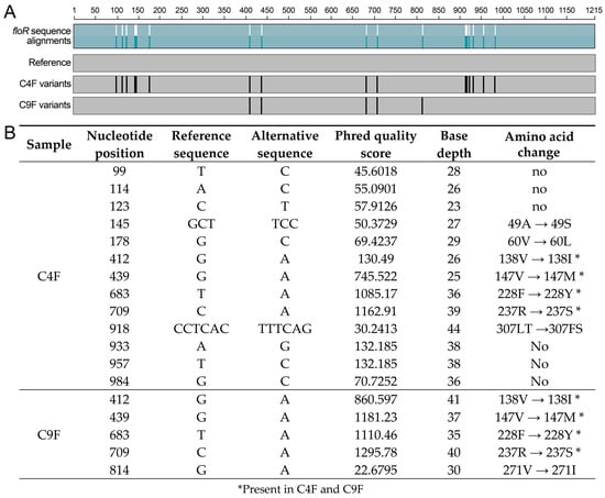Nucleotide variations in metagenomic sequences of the floR gene. (A) schematic representation of nucleotide alignment of the floR reference gene and the nucleotide changes (variants) found in the C4F and C9F metagenomes. (B) SNP base-calling results for C4F and C9F metagenomes. The table shows specific nucleotide changes in metagenomic sequences for each sample (C4F and C9F), the nucleotide position in the gene, the reference nucleotide identity for each position, the alternative sequence (nucleotide change found in each metagenome), the phred quality score and base depth for each alternative nucleotide and the corresponding amino acid change.