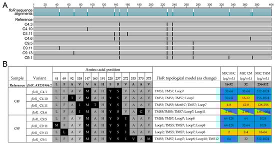 Phenotypic characteristics of the FloR variants. (A) Schematic representation of the protein alignment of the FloR reference protein sequence and the sequence variants found in the C4F and C9F clones. (B) Table showing the FloR variants identified in the clones from each sample (C4F and C9F), the amino acid position of the aminoacidic change in the translated protein, the location of the aminoacidic change in the FloR topological model, according to Braibant et al.’s protein model [], and the MIC results for the eight clones with floR gene variants from C4F and C9F to three phenicol antibiotics (FFC, florfenicol; CM, chloramphenicol; THM, thiamphenicol). The reference amino acids are shown in gray, and the changes in the variants are highlighted in black. In the MIC results, gray represents the reference values (MIC for FloR reference sequence), blue represents an increase in MIC values and yellow represents a decrease.