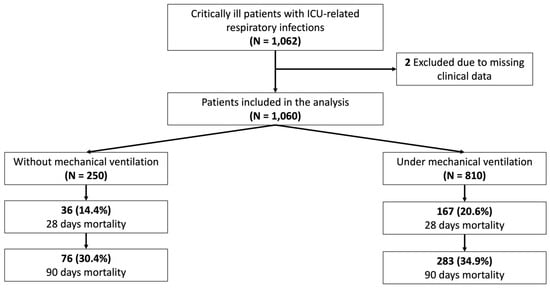 The final model is adjusted based on the most significant and relevant covariates, ensuring appropriate adjustment and minimizing bias in estimating associations between risk factors and mortality. Then, multivariable logistic regression models assessed risk factors (HR [95% CI]) associated with 28 d and 90 d mortality among non-ventilated and ventilated patients. In the multivariate test, 28 and 90 days of mortality were taken as the dependent dichotomic variables. The non-IMV model was adjusted by age, taken as a dichotomic variable (>65 years), and severity using the SAPS II score as a continuous variable. The IMV model was adjusted by age and severity, and the SAPS II score was used in both cases as a continuous variable. The goodness of fitness of the multivariable logistic regression models was assessed with the Hosmer–Lemeshow test, and the level of significance considered at two-tailed was a p-value < 0.05. All the analyses were performed in the SPSS statistical package, version 29.