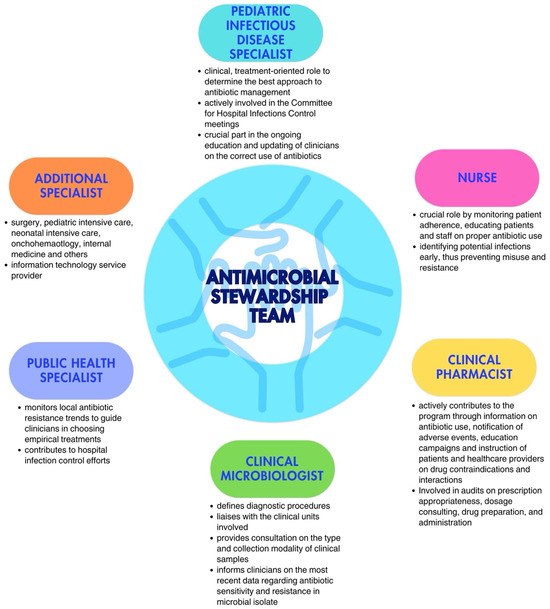 Every ASP requires a multidisciplinary team tasked with defining governmental policies for the responsible use of antibiotics, aligning with infection control protocols [20,21]. The Antimicrobial Stewardship Team (AST) in pediatric care should be led by a pediatric infectious disease specialist or, when absent, by a pediatrician with expertise in antibiotic therapy. This role is essential for ensuring that treatment recommendations and guidelines are grounded in the latest evidence in the field. Including a physician specializing in pediatric infectious diseases strengthens the program’s credibility. Direct engagement with prescribing physicians and the clinical governance committee is crucial; interaction with the former helps educate them on improved prescribing practices and fosters collaboration in discussing challenging cases or barriers faced during the program’s implementation; engagement with the latter is necessary to secure formal approval and financial support for the program’s execution [22].