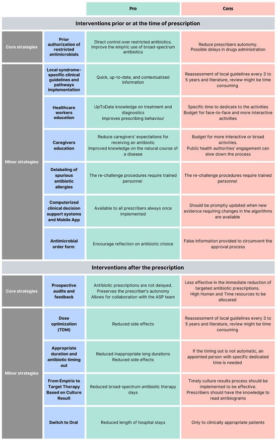 ASP interventions can be classified as core strategies (i.e., pre-authorization of restricted antimicrobials and prospective audit and feedback), minor interventions [16], or interventions before and after the prescriptions [24]. According to the Infectious Diseases Society of America and the Society for Healthcare Epidemiology of America (IDSA/SHEA) guidelines, programs should determine whether to include one core strategy or a combination of both strategies, based on the availability of facility-specific resources for consistent implementation, but some implementation is essential [25]. Each of these interventions has pros and cons (Figure 2).