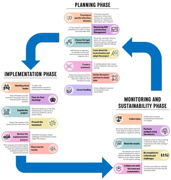 Implementing an ASP requires careful adaptation to specific settings, also considering hospital capacity, patient complexity, and hospital workload, as no fixed model or consensus regarding the best approach exists [24,118,119]. The process can be divided into three phases, as shown in Figure 3.