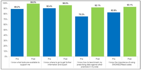 A 16.9 percentage point (pp) increase was observed in attendees knowing how to benchmark prescribing data (92%, 93/101); a 10.3 pp increase was observed in attendees understanding the importance of using clinical codes (93%, 94/101) (Figure 1).