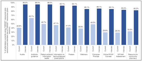 Following the training session, a large increase was observed in attendees’ intentions to implement a range of AMS tools/resources within their practice (Figure 2); AMS tools with the highest intention to use included audits (40.8% before vs. 96%, after), patient information leaflets (49.7% before vs. 96% after), and antibiotic guidance (63.7% before vs. 96% after).