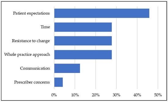 In total, 97% (98/101) of attendees agreed that they will be able to apply actions from the training session in their practice; 96% (97/101) anticipate they will see positive results from these actions. The majority of attendees plan to implement actions within 0–3 months after the event (47%, 47/101) or within 3–6 months (30%, 30/101). A total of 72 attendees responded to a free text question in relation to the anticipated barriers to implementing learning, following training. Responses were coded (Figure 4) with the highest perceived barrier being managing patient expectations about receiving antibiotics (46%, 33/72). Patient expectations ranged from historical prescribing for the same, or similar symptoms, to inconsistent prescribing between prescribers within and outside the practice. Prescriber concerns was the least reported perceived barrier (4%, 3/72).