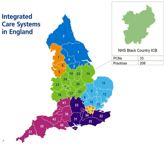 Location for TARGET training case study—NHS Black Country ICB. Source: https://www.england.nhs.uk/integratedcare/integrated-care-in-your-area/ (accessed on 24 September 2024).