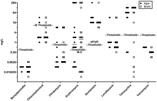 Antimicrobial sensitivity testing was compared using Muller Hinton Fastidious (MH-F) broth (BD, Franklin Lakes, NJ, USA) in 96-well plates and MH-F agar (Neogen, Lansing, MI, USA) in 90 mm petri dishes, both supplemented with 5% lysed horse blood (TCS Biosciences, Buckingham, UK) and β-nicotinamide adenine dinucleotide as per EUCAST guidelines. []. MICs were determined for benzylpenicillin, chloramphenicol, clindamycin, erythromycin, gentamicin, levofloxacin, tetracycline, and vancomycin (Sigma-Aldrich, Dorset, UK) at concentration ranges between 0.008–128 mg/L. All data points were obtained in triplicate.