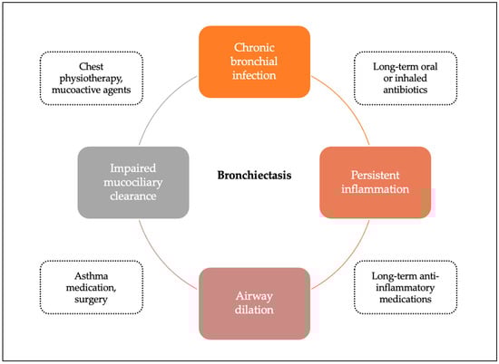 Since lower respiratory tract infections account for the majority of cases of bronchiectasis, understanding the host immune mechanisms that contribute to recurrent infection and prolonged inflammation has been recognized as a significant field of research to provide effective preventive measures for children at risk of bronchiectasis. It appears that suboptimal adaptive immune responses, apart from dysregulated local inflammatory responses, are likely to contribute to an environment prone to chronic or recurrent infections. The inflammatory profile (e.g., airway neutrophilia, increased concentration of interleukin-1β, and matrix metalloproteinase), impaired efferocytosis (clearance of apoptotic cells by phagocytes), and increased expression of genes related to macrophage function and impaired resolution of inflammation in both PBB and bronchiectasis reveal the framework of the pathogenesis of “idiopathic” bronchiectasis [55]. Unfortunately, these recent tremendous advances in our understanding of immunological parameters have not led to new effective treatments, and current management strategies for children still rely mainly on antibiotic therapy and physiotherapy.