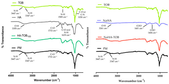 The infrared spectra (FT-IR) of HA-TOB, NaHA-TOB, PMs of each system, and raw materials were obtained in the range of 4000 to 650 cm−1. An FT-IR spectrometer (Cary 630 FT-IR spectrometer, Agilent®, Santa Clara, CA, USA) programmed to a spectral resolution of 4 cm−1 and an average of 40 scans per spectrum was used. The samples were analyzed using the OMNIC 8.3 software.