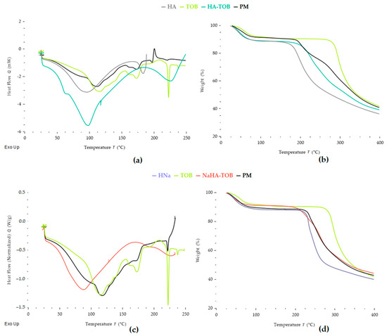 DSC and TGA thermograms, depicted in Figure 2, showed the thermal characteristics of HA-TOB, NaHA-TOB, their precursors, and their PMs in order to determine not only the thermal stability of each independent material but also the changes produced by interactions due the formation of the complex [28,29,30].