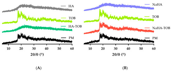 Complementary PXRD patterns of TOB, HA, NaHA, both complexes, and its PM were carried out. As can be seen in Figure 3, HA and NaHA presented an amorphous solid diffraction pattern, evidenced by the absence of peaks, and this characteristic has been previously reported [10]. On the other hand, TOB showed a diffractogram without a sharp peak, but with some defined peaks at 2ϴ values between 17° and 26°, in accordance with other authors [37,38,40]. In both PMs, the same series of defined peaks were observed, but with a lower intensity, possibly due to the presence of an amorphous solid, HA or NaHA, which has an impact in the obtained pattern. Interestingly, in the diffractogram of HA-TOB, these peaks disappear and an amorphization of the solid is observed, i.e., the TOB loses its characteristic semi-crystalline diffractogram due to an interaction with HA. This rearrangement at the molecular level is indicative of a successful PE-D interaction and has been previously observed [41,42,43]. However, when the NaHA-TOB pattern was analyzed, it retained the characteristic peaks of TOB as well as its PM, perhaps due to a weaker or incomplete interaction between NaHA and TOB due to the presence of the sodium counterion. This displacement in the ionic complex, as evidenced by the crystalline peaks in PXRD, might not be sufficient to observe the melting peak by DSC (Figure 2)