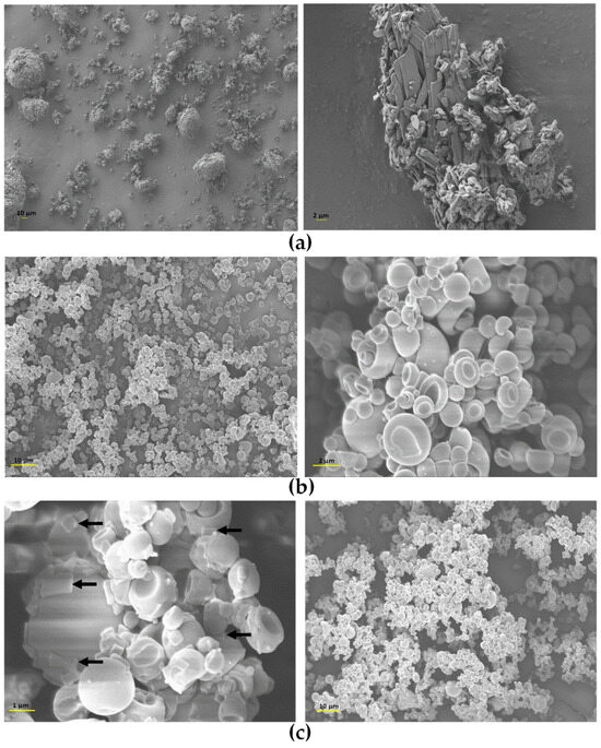 Scanning electron microscopy (SEM) micrographs of TOB (a), HA-TOB (b), and NaHA-TOB (c) obtained by spray drying with magnifications of 500×, 1000×, 5000×, and 10,000×. The arrows indicate the deposition on the particles of crystalline non-complexed TOB.