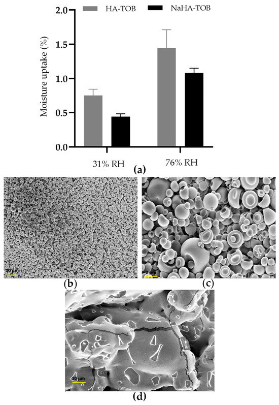 Moisture uptake of the complexes stored at 25 °C and a relative humidity (RH) of 31 and 76 (a). SEM micrographs of HA-TOB at a magnification of 1000× (b) and 5000× (c), and NaHA-TOB at a magnification of 1000× (d) after storage at 25 °C and 76% HR in a sealed container.