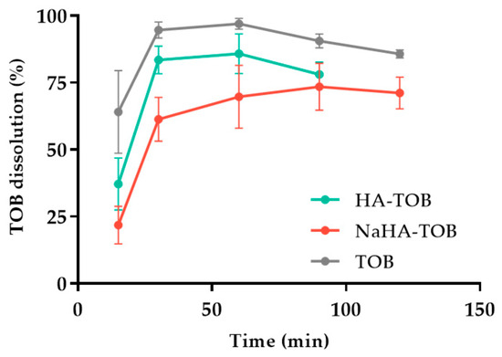 The dissolution profile of TOB, HA-TOB, and NaHA-TOB is depicted in Figure 7, showing differences between all of them (f2 < 41.0). As it was expected, the TOB, without a PE interaction, presented the fastest dissolution profile, followed by HA-TOB and NaHA-TOB with 94.6%, 83.4%, and 61.3% dissolution percentages in the first 30 min of the experiment, respectively. The PE presence in contact with the dissolution media might be producing the gelation and swelling, causing the reduction in dissolution speed presented below. Furthermore, the previously shown semi-crystalline state of the NaHA-TOB can be the reason why the dissolution profile of the respective complex occurred to be slower than the amorphous complex HA-TOB. Nevertheless, the fast dissolution rate obtained for both complexes is an important aspect that can possibly have an impact in the reduction in side effects, such as irritation of the throat, related to persistent residual particles in the surface of the lung epithelium, and just as well, the reduction in macrophage phagocytosis and/or mucociliary clearance, avoiding a fast drug removal from the lungs [47,84,85].