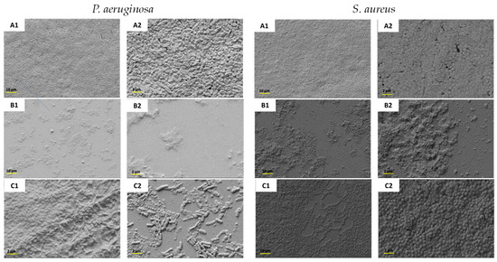 SEM micrographs at a magnification of 1000× (1) and 5000× (2) of the biofilm produced by P. aeruginosa and S. aureus not treated (A1,A2) and treated with HA-TOB to evaluate the inhibition (B1,B2) and eradication (C1,C2) of the respective strains.
