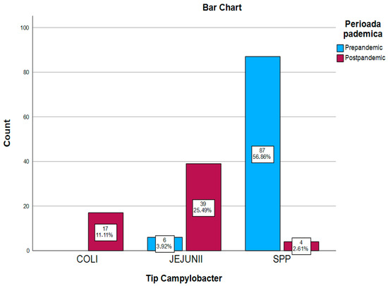 The analysis of the distribution of Campylobacter species (C. coli n = 17; C. jejuni n = 46; C. spp. n = 91) highlighted significant differences between the pre-pandemic and post-pandemic periods (Table 2).