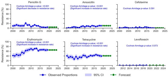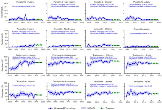 Figure 1 depicts the evolution of S. pneumoniae resistance over two decades, 2000–2019, and the forecasted resistance rates post-2019. The resistance rate to penicillin G significantly decreased from 9–13.7% during 2000–2002 to 2.9–4.3% in 2016–2019 (p < 0.001). However, this rate increased temporarily in specific years such as 2007 (20.9%) and 2012 (13.8%). Using time series analysis, the prevalence of resistant strains to penicillin G was predicted to remain below 10% during 2020–2024.