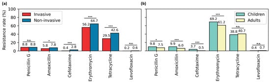 Antimicrobial resistance rates of pneumococcal isolates by site of infection (a) and age (b) in Tunisia (2000–2019). p-values are indicated as follows: * 0.01 < p ≤ 0.05; *** p ≤ 0.001; n.s.: not significant.