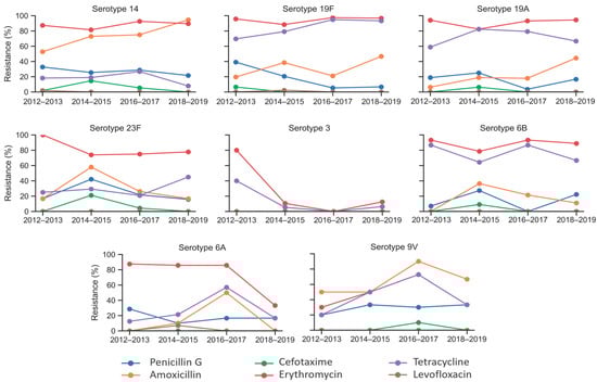 Resistance trends varied among the top eight serotypes, as shown in Figure 4. Serotype 3 exhibited a sharp decline in resistance to erythromycin and tetracycline, which decreased from 80% and 40% in 2012–2013 to 12.5% and 6.2% in 2018–2019, respectively. Other serotypes demonstrated fluctuating resistance patterns throughout the study period. Nevertheless, notable decreases were observed in erythromycin resistance for serotypes 23F and 6A, which fell from 100% and 88% in 2012–2013 to 78% and 33% in 2018–2019, respectively. Penicillin G resistance also declined for serotypes 19F and 6A, decreasing from 39% and 29% in 2012–2013 to 7% and 17% during 2018–2019, respectively. Conversely, amoxicillin resistance increased among serotypes 14, 19F, 19A, and 9V over the study period.