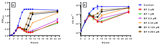 Initially, the effect of a wide range of 2-fold increasing concentrations of bactofencin A (0.063, 0.125, 0.250, 0.5, 1 and 2 µM) on the OD600 and viable cell numbers of a growing culture of S. aureus DPC5246 was measured. The optical density readings (Figure 1A) suggest that bactofencin A had little or no effect on growth for the first 3–4 h regardless of concentration. After 4 h, the growth rate of bactofencin A-treated cultures slowed compared to the control; this became more apparent from 5 h onwards, when the OD600 decreased, suggesting cell lysis. After 7 h, the cultures appeared to recover in a concentration-dependent manner, with samples containing lower bactofencin A concentrations recovering before those containing higher concentrations. Interestingly, after 23 h, the OD600 for higher bactofencin A concentrations (0.5, 1 and 2 μM) remained lower than the control, suggesting that bactofencin A was still having an inhibitory effect on the culture at these concentrations.