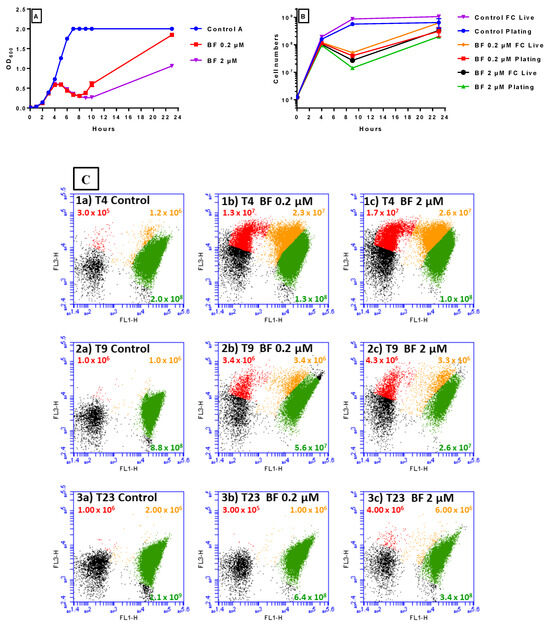 In addition to enumerating live cells (green), the flow cytometry results, which were corrected to exclude background debris (black), show the number of dead (red) and injured (orange) cells (Figure 2C) at 4, 9 and 23 h. At 4 h, the untreated control contains 2 × 108 live cells and about 100-fold fewer injured cells (1.2 × 106) and dead cells (3 × 106) which is indicative of a “healthy” log phase culture (Figure 2C(1a)). In comparison, the 0.2 μM (Figure 2C(1b)) and 2 μM bactofencin A (Figure 2C(1c))-treated cultures contained slightly fewer live cells than the untreated control (1.3 × 108 and 1.0 × 108) but approximately 20-fold higher levels of injured (2.3 × 107 and 2.6 × 107) and 50-fold higher numbers of dead cells (1.3 × 107 and 1.7 × 107). At 9 h, the effect of bactofencin A on live cells was apparent, as the untreated control sample contained 8.8 × 108 (Figure 2C(2a)) compared to a 1.3–1.6-log reduction (5.6 × 107 and 2.6 × 107) detected for 0.2 μM (Figure 2C(2b)) and 2 μM (Figure 2C(2c)) bactofencin A, respectively. However, the number of injured (3.4 × 106, and 3.3 × 106) and dead cells (3.4 × 106 and 4.3 × 106) was now just 3-fold higher than the control sample (1.0 × 106). At 23 h, we again observed that bactofencin A had a slight inhibitory effect on the culture as the untreated control contained 1.1 × 109 live cells (Figure 2C(3a)) while 0.2 μM bactofencin A (Figure 2C(3b)) contained 6.4 × 108 and 0.2 μM bactofencin A (Figure 2C(3c)) contained 3.4 × 108 live cells. Notably, at this stage, the numbers of injured and dead cells are comparable to the untreated control.
