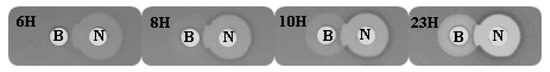 Antimicrobial interaction between 10 μM bactofencin A (B) and 10 μM nisin A (N) against S. aureus DPC5246 at 6, 8, 10, and 23 h.