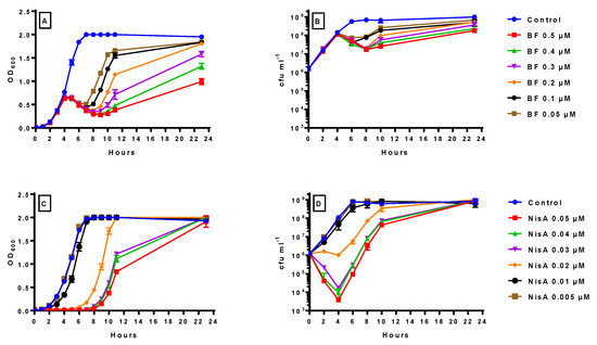 Nisin A was assayed at a 10-fold lower concentration range (0.05–0.005 µM) than bactofencin A, given its greater potency at earlier stages of growth. One thing to note is that higher nisin A concentrations inhibit the cultures immediately (Figure 4C) and also that the delay in recovery is concentration-dependent. At 23 h, all nisin A-treated cultures grew to the same extent as the untreated control, regardless of the nisin A concentration. The plate count results (Figure 4D) show a similar trend in terms of viability, where the higher concentrations reduced the viability of the culture for the first 4 h, which then recovered in a dose-dependent fashion.