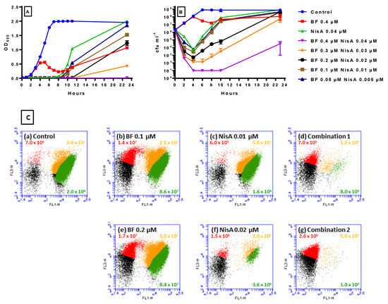 The effect of bactofencin A/nisin A combinations on S. aureus DPC5246 as measured by OD600 (A) and cfu mL−1 (B) and flow cytometry of bactofencin A 0.1 or 0.2 µM alone, nisin A 0.01 or 0.02 µM alone, and bactofencin A/nisin A 0.1/0.01 or 0.2/0.02 µM combinations at 4 h (C). Growth experiments were carried out in duplicate and standard deviation is displayed as the error bars shown in the graphs. (C) The effect of bactofencin A/nisin A combinations on S. aureus DPC5246 as measured by flow cytometry at 4 h. (a) 0 µM control, (b) 0.1 µM bactofencin A, (c) 0.1 µM nisin A, (d) 0.01 µM bactofencin A/nisin A, (e) 0.2 µM bactofencin A, (f) 0.1 µM nisin A, and (g) 0.01 µM bactofencin A/nisin A.