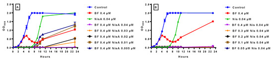 The effect of decreasing nisin A concentrations in relation to bactofencin A (Figure 6A) and decreasing bactofencin A in relation to nisin A (Figure 6B) was assessed to determine the contribution each bacteriocin makes to activity. In both experiments (Figure 6A,B), the control samples (untreated control, bactofencin A alone and nisin A alone) were similar to those shown in Figure 5A. Treatment of S. aureus DPC5462 with 0.04 µM bactofencin A and decreasing nisin A concentrations resulted in inhibition of culture for 7 h at all combinations tested (Figure 6A). Recovery occurred in a dose–response manner, as evidenced by bactofencin A 0.4 µM/nisin A 0.005 µM and bactofencin A 0.4 µM/nisin A 0.01 µM starting to recover at 8 and 9 h, respectively, while the three higher nisin A concentrations were still inhibitory at 11 h. At 23 h, there was a reduction in OD600 at all bactofencin A/nisin A combinations assayed compared to the untreated control, while bactofencin A 0.4 µM/nisin A 0.04 µM was totally inhibited. Overall, the results suggest that while the cultures are significantly inhibited at all combinations tested, decreasing the nisin A concentration results in less inhibition.