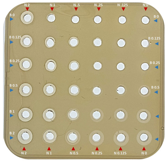 Inhibitory effect of decreasing concentrations of nisin A (2, 1, 0.5, 0.25, and 0.125 μM, horizontally across the plate) in combination with increasing concentrations of bactofencin A (2, 1, 0.5, 0.25, and 0.125 μM, vertically down the plate) on S. aureus DPC5246.