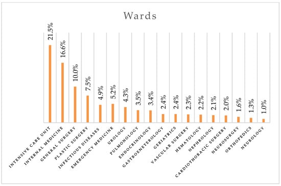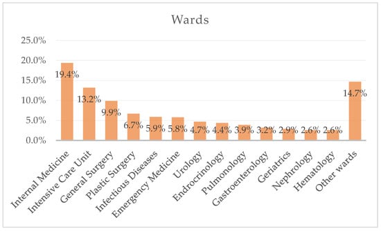 In our study, 11,607 specimens from 4916 patients were analyzed. The number of specimens associated with a single patient ranged from 1 to 45. The median age of the patients was 69 years (IQR 57–78). A total of 2770 patients were male (56.3%), and 58.4% of the specimens were collected from male patients. The wards of admission for these patients are depicted in Figure 1. Most patients were admitted to the Internal Medicine Unit (19.4%), the Intensive Care Unit (ICU, 13.2%), and the General Surgery Unit (9.9%). Only 5.9% were admitted to the Infectious Diseases Unit, while 14.7% were admitted to other wards.