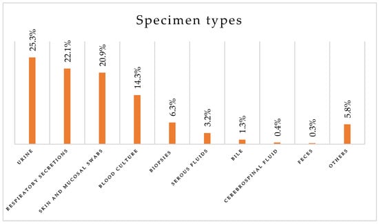 Most collected specimens were urine (25.3%) and respiratory secretions (22.1%), including sputum, bronchoalveolar lavage, and tracheal aspiration. Skin and mucosal swabs accounted for 20.9% of the specimens, while blood cultures constituted 14.3% (Figure 3).