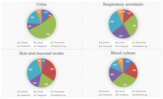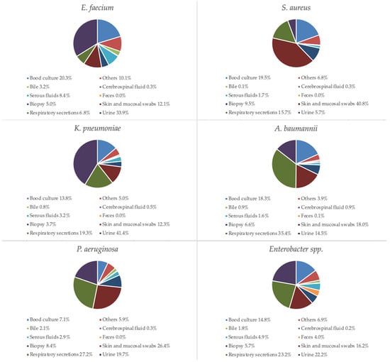 Regarding specimen type distribution for specific pathogen, most of Enterococcus faecium isolates were obtained from urine specimens (33.9%) and blood (20.3%), Staphylococcus aureus from mucocutaneous swabs (40.8%) and blood (19.5%), Klebsiella pneumoniae from urine (41.4%) and respiratory specimens (19.3%), Acinetobacter baumannii from respiratory specimens (35.4%) and blood (18.3%), Pseudomonas aeruginosa from respiratory specimens (27.2%) and mucocutaneous swabs (26.4%), and Enterobacter spp. from respiratory specimens (23.2%) and urine (22.2%), as shown in Figure 4. The Enterobacter spp. included E. cloacae (71.3%), E. aerogenes (17.4%), E. hormaechei (1.9%), E. asburiae (0.7%), E. gergoviae (0.6%), E. kobei (0.6%), E. intermedius (0.4%), E. sakazakii (0.1%), and other unspecified species (6.9%).
